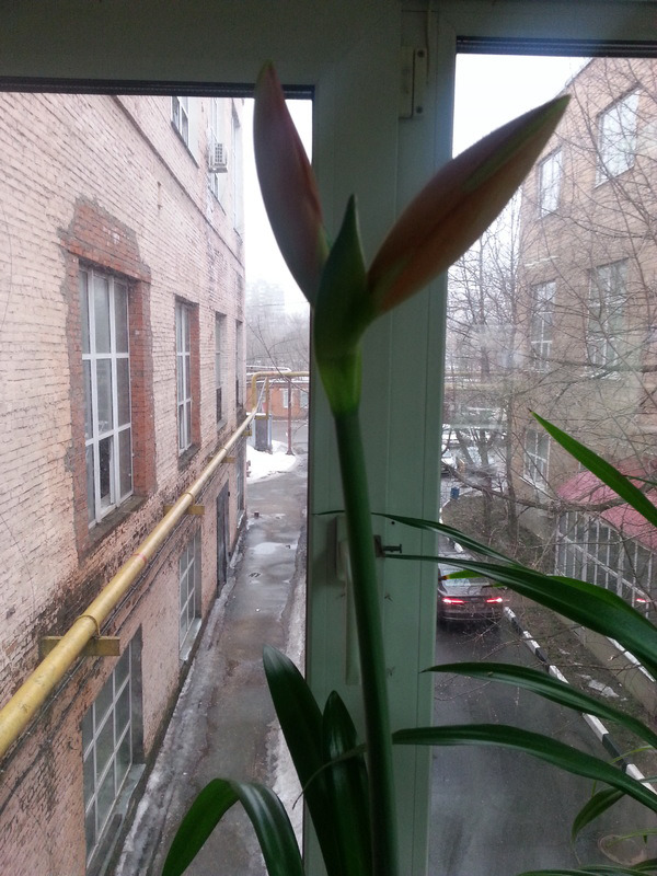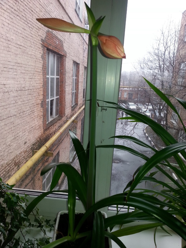 После осмотра цветка мы сделали предположение, это амариллис? Но бегло погуглив, я вычитала, что амарилллисы цветут только осенью, а если зацвел по весне, то это гиппеаструм!