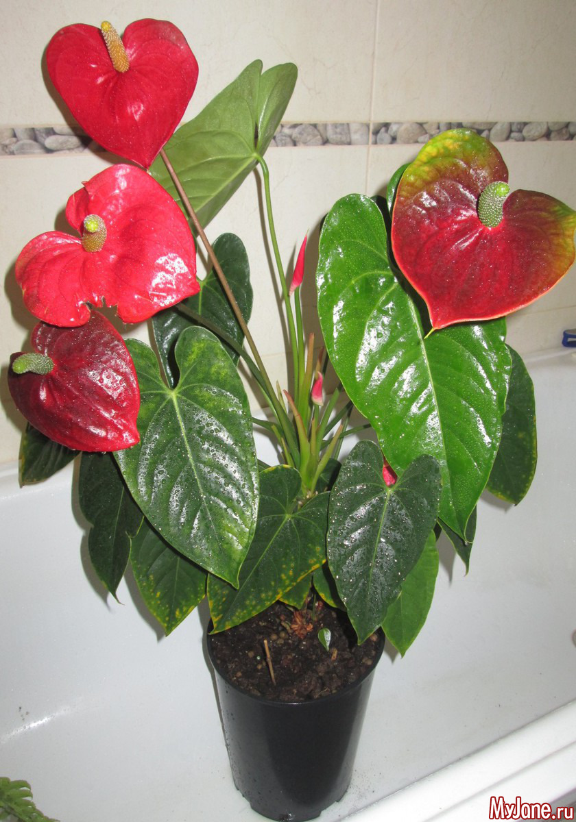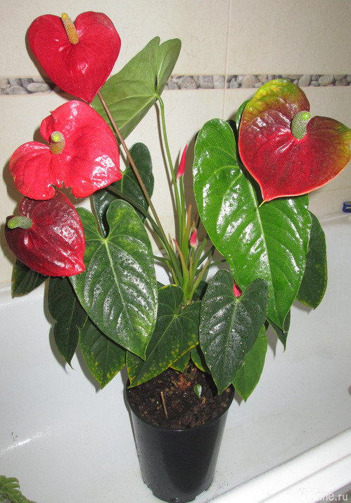 Антуриум разрастается с каждым годом всё больше, наверное, горшок нужен еще вместительнее и глубже. Становятся намного крупнее и цветы и листья.