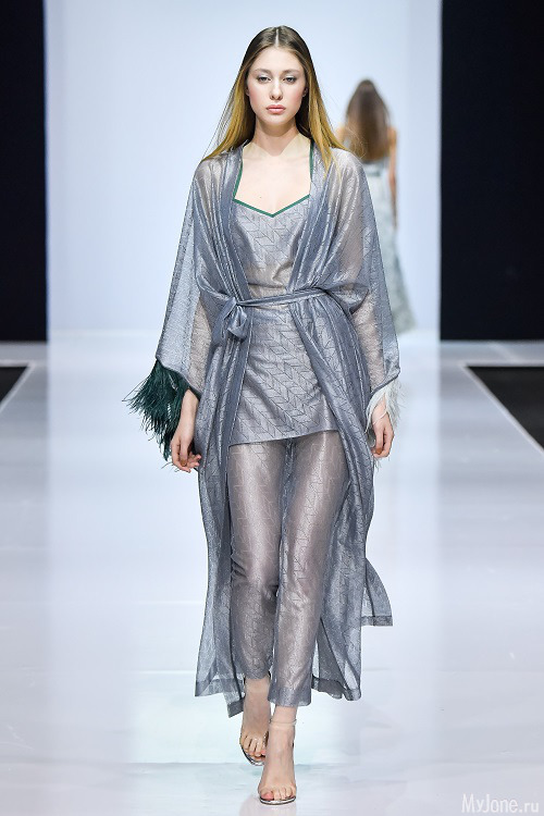 Коллекция получилась легкомысленно-цветочной и невесомо-сказочной. Осенне-зимняя палитра лилово-сливовых и оливково-серых сочетаний мохера дополнена кремовым кружевом и расшитой органзой. Образы скомбинированы из летящих полупрозрачных фактур, созвездия оборок, многослойности и тончайшей вышивки.