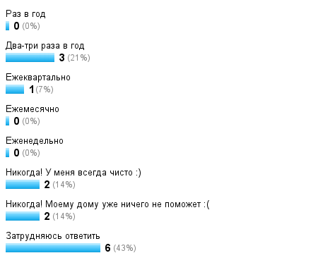 И все же я ее делю, окна мою по одному штуке. Генералю в шкафах , через неделю могу отодвинуть все диваны через месяц помыть диваны и т.п. чтоб вот так с ног до головы в кв генеральную в один день не делаю.
