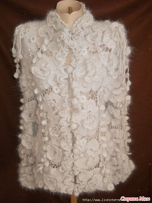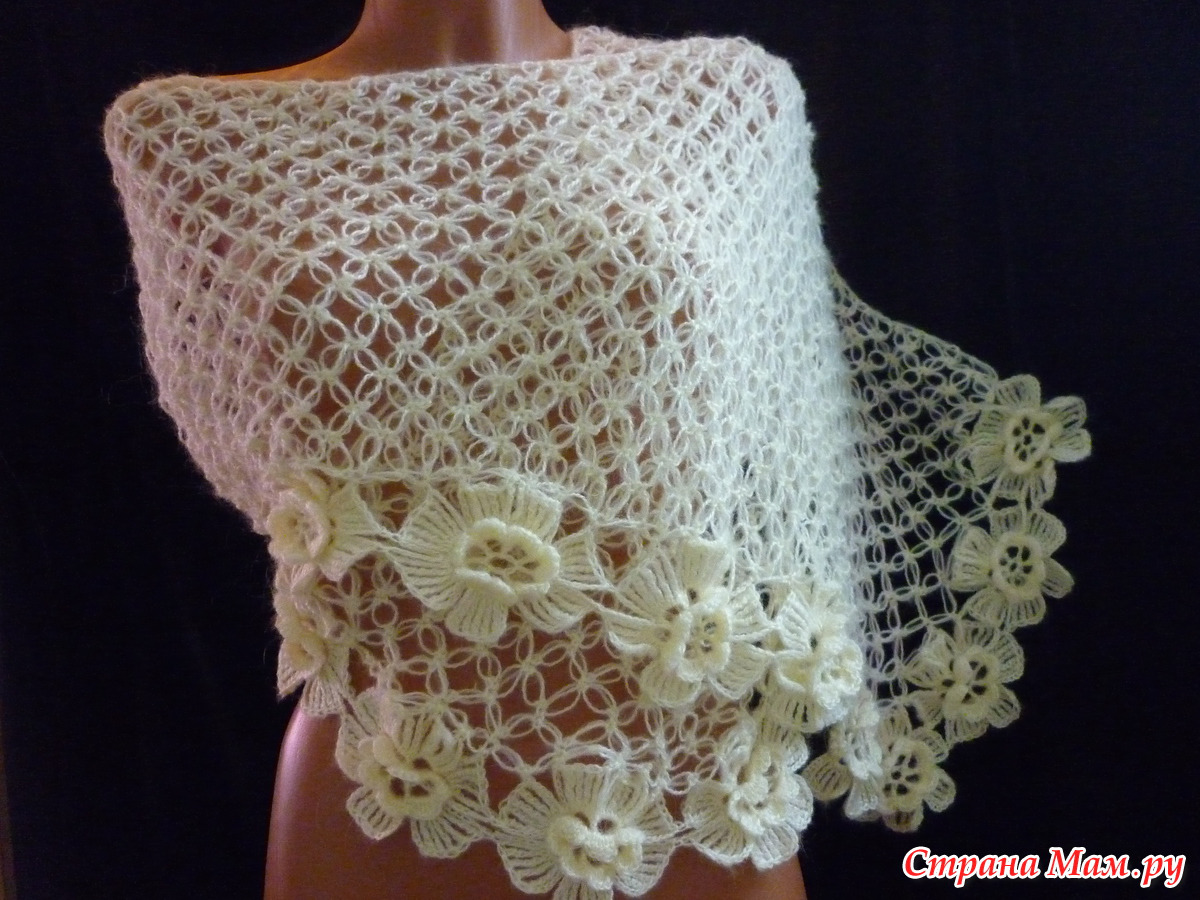 Нужен совет в таком вопросе. Вяжу палантин из Камелота (мохер). Ниточка очень тоненькая и пушистенькая. Основное полотно вяжу просто лицевой гладью в 3 нити. А вот края планирую украсить широкой каймой с цветочными элементами (по принципу ирландского кружева).