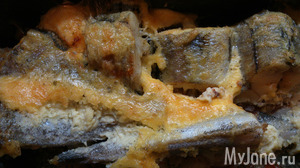 ), моете-режете его. На противень наливаете немного масла, кладете помидорку-перец-морковь (что есть дома, можно все сразу), сверху рыбку и заливаете его будущей "шубой". Обычно я взбиваю сметану с яйцом. Минут на 30 в духовку и все - можно кушать. Вкусно и быстро.