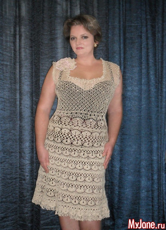 Платье полуприлегающего силуэта. Юбка-трапеция. Украшение -вязаная брошь -цветок.