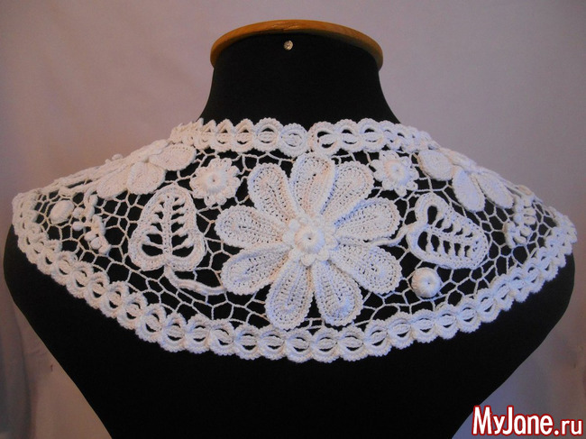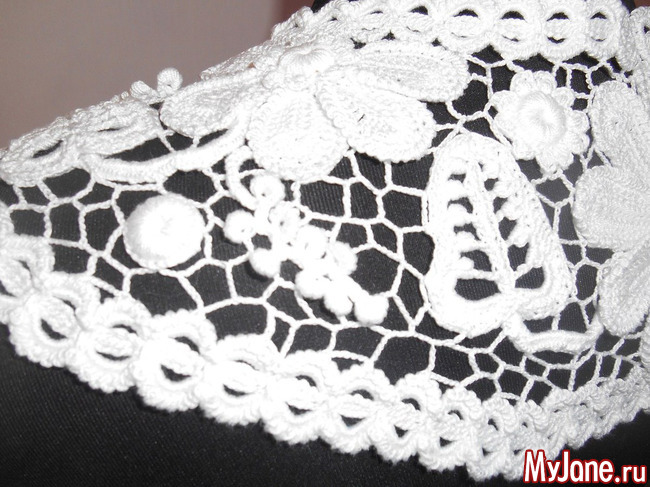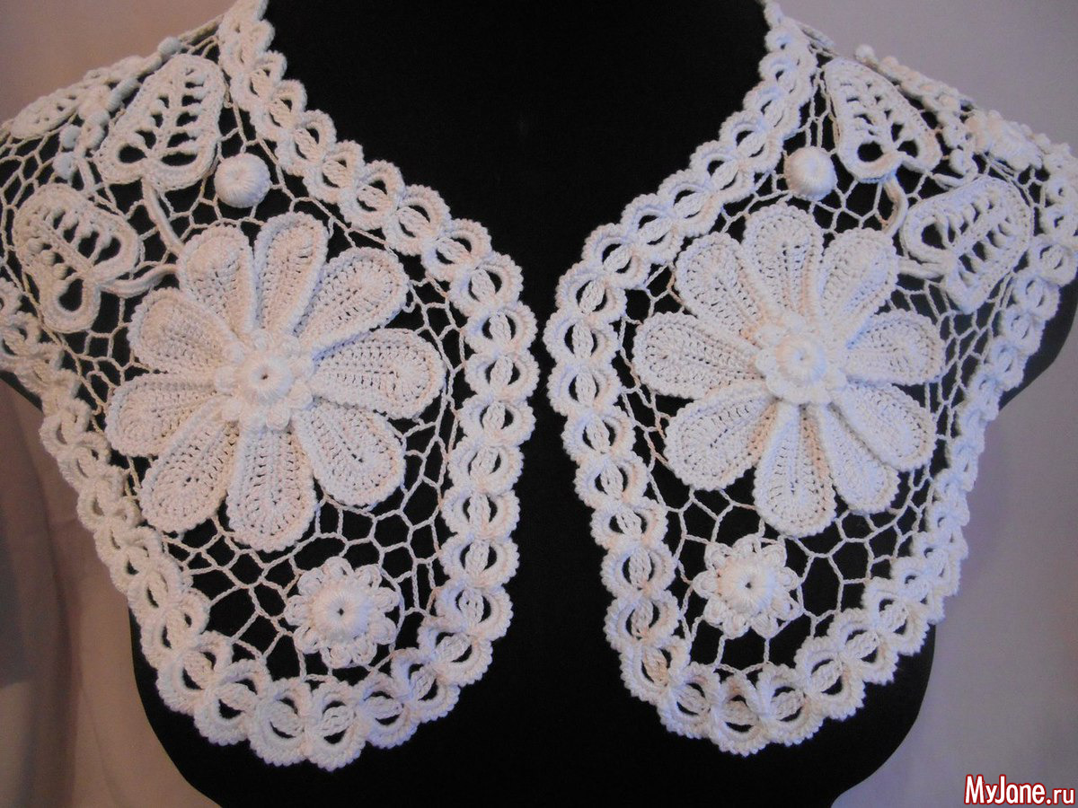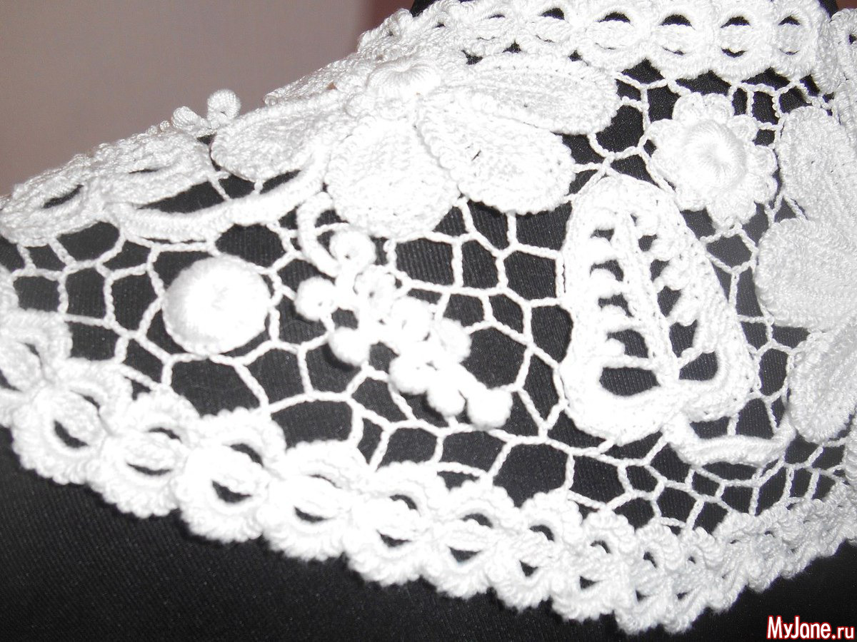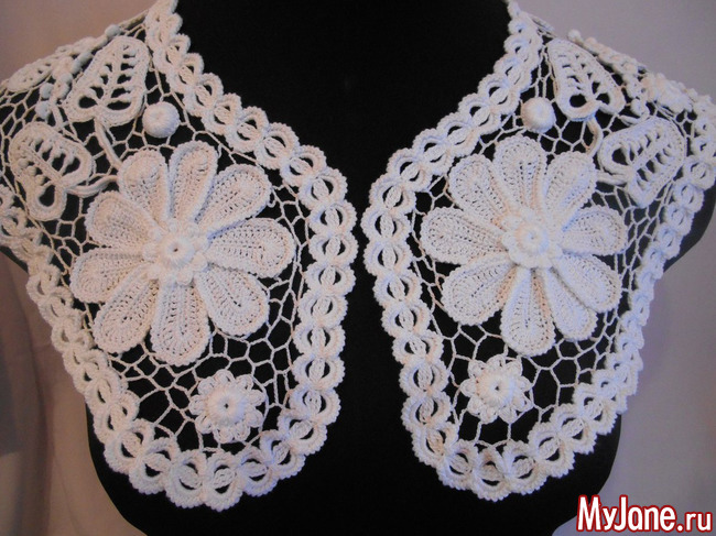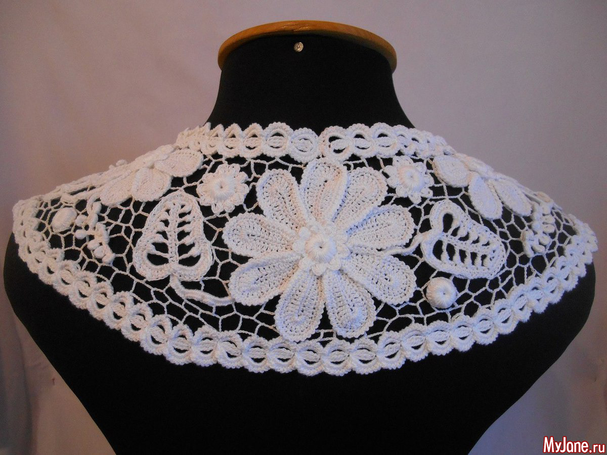 Воротничок выполнен в сложной технике наборного ирландского кружева из хлопка Виолет на мотивы в 50 гр- 280 м, крючок 1,0 и хлопок Канарис на сеточку в 20 гр- 200 м, крючок 0,8.