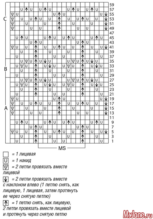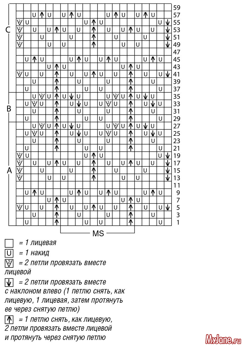 Число петель кратно 10 + 1 + 2 кромочные = вязать согл. схеме. На ней даны лицевые ряды. В изнаночных рядах все петли и накиды провязывать изнаночными. Начать с 1 кромочной и петель перед раппортом, раппорт постоянно повторять, закончить петлями после раппорта и 1 кромочной. Выполнить 1 раз 1–28-й ряды.