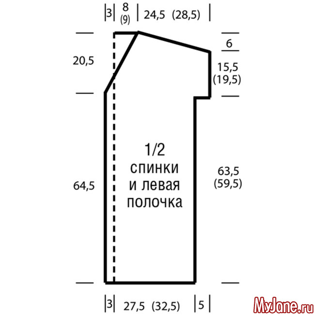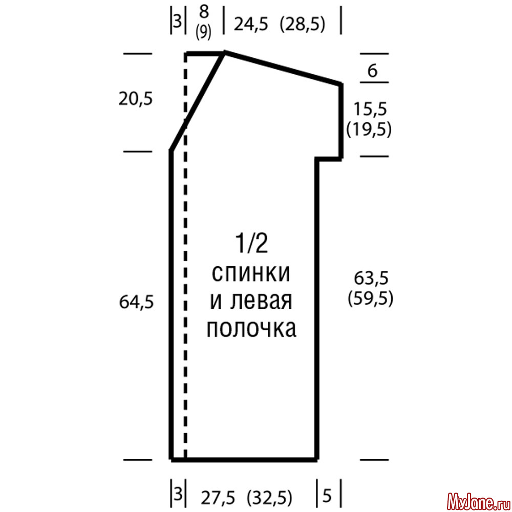 Через 64,5 см = 158 рядов от начального ряда закрыть для скоса горловины по левому краю 1 x 1 п., затем в каждом 2-м ряду 22 (24) x 1 п.