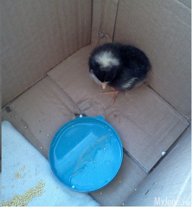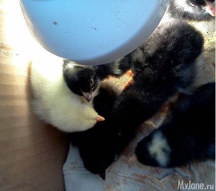 На следующий день малышей посадили в "ясельный" ящик, вручив их маме-курицы.