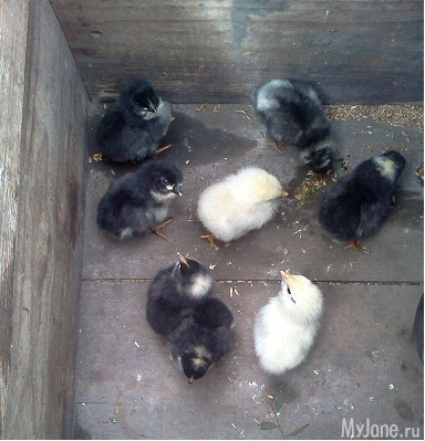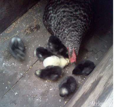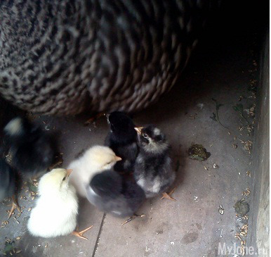 И вот в воскресенье пришел день Х. С утра Петя с курочками как всегда навестили квочку, но не ушли, а стоят и чего-то активно обсуждают. Сережа проверил. Точно. Появились первый цыплята.