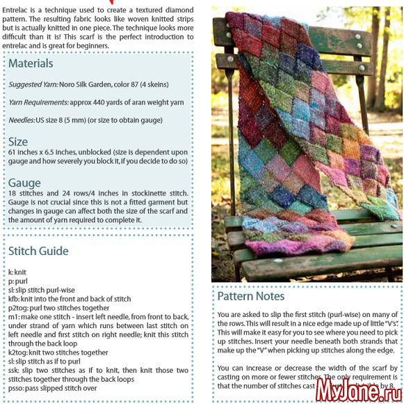Entrelac - это метод, используемый для создания текстурированного алмазного рисунка. Полученная ткань выглядит как тканые трикотажные полоски, но фактически вязана в одном куске. Техника выглядит более сложной чем она есть! Этот шарф - идеальное введение в Entrelac и отлично подходит для начинающих.