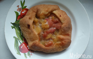 Раскатываем лепешки, в серединку каждой кладем начинку, загибаем края (полностью не закатываем) и в духовку на час примерно. Минут за 10 до конца наливаем в каждый пирожок бульон и/или сливки по чайной ложке и смазываем яйцом. Выключаем. Наслаждаемся.