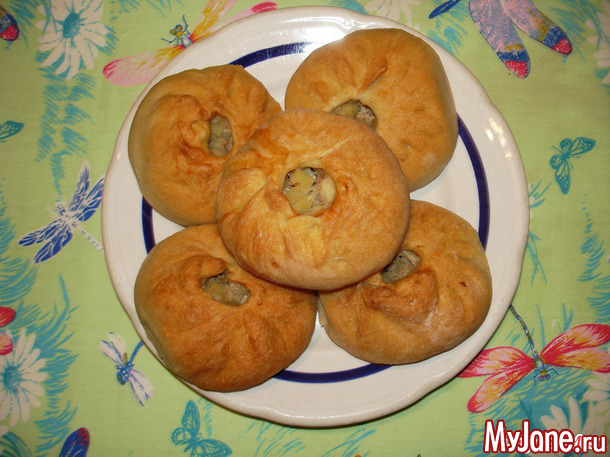 Раскатываем лепешки, в серединку каждой кладем начинку, загибаем края (полностью не закатываем) и в духовку на час примерно. Минут за 10 до конца наливаем в каждый пирожок бульон и/или сливки по чайной ложке и смазываем яйцом. Выключаем. Наслаждаемся.
