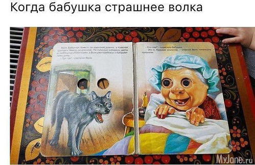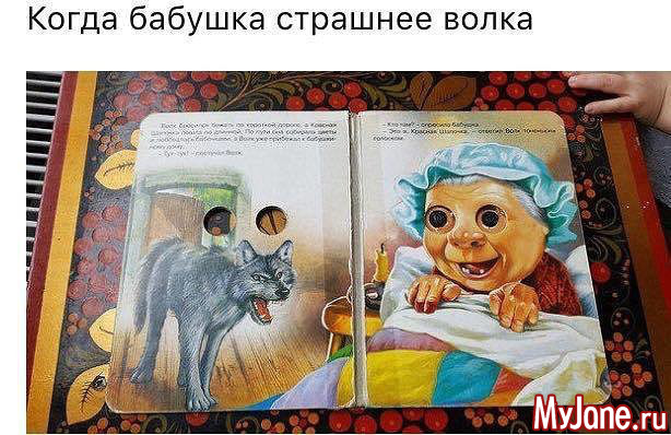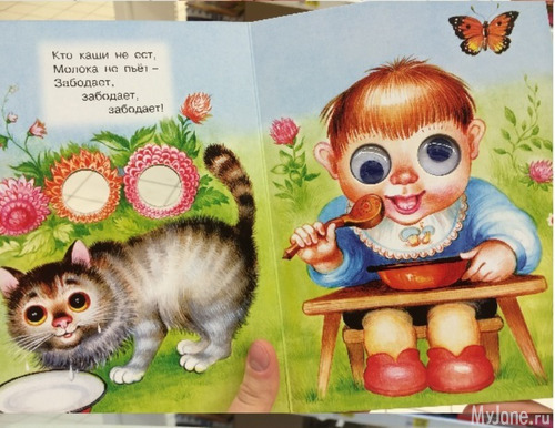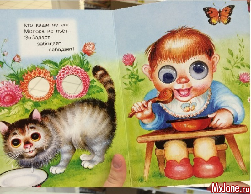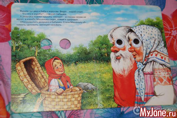 Видела книжку про курочку-рябу, такую же, с бегающими глазами. Но там везде был нарисован петух с шикарным хвостом, а никакая не курица!