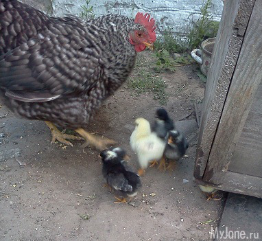 Куры (2 из них впервые видели цыплят) были потрясены.