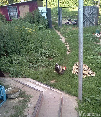 Руки крылья в боки и вперед. Сначала налетела и прогнала 3х куриц, потом понеслась на Петю. Тот даже опешил от такой наглости. Но курочка вовремя спохватилась.