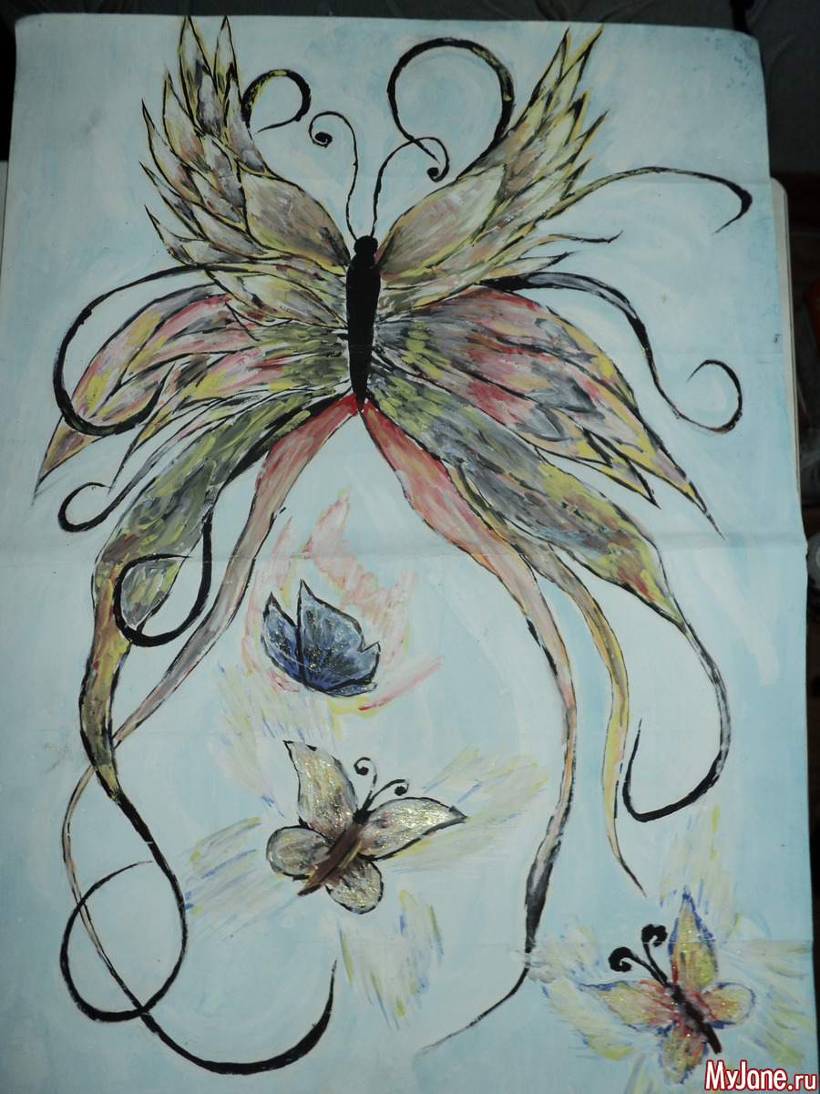 Бабочку увидела в какой тетради и по памяти нарисовала, немного по своему. При росписи использовала всего 6 цветов гуаши, мне было 19 лет.
