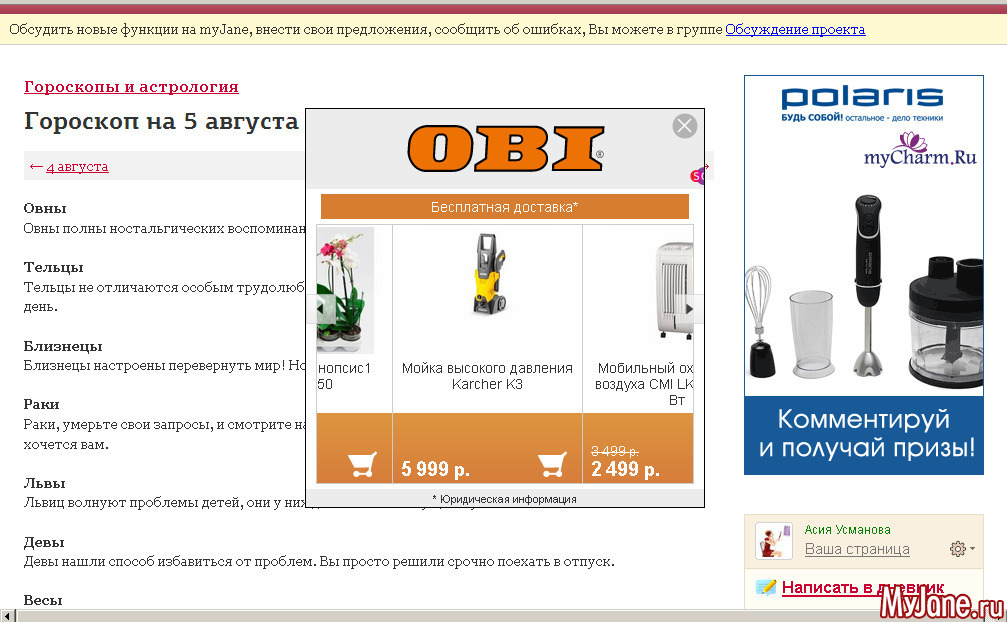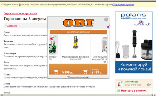 Добрый вечер! Вот уже который раз заходя на сайт через письмо, мне выходит реклама гипермаркета ОБИ. Это у вас так специально сделано или вирус, не знаю чей. То ли я подцепила через этот сайт, то ли вы подцепили.