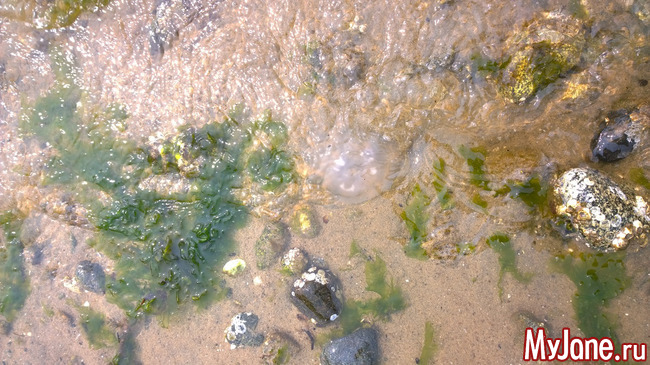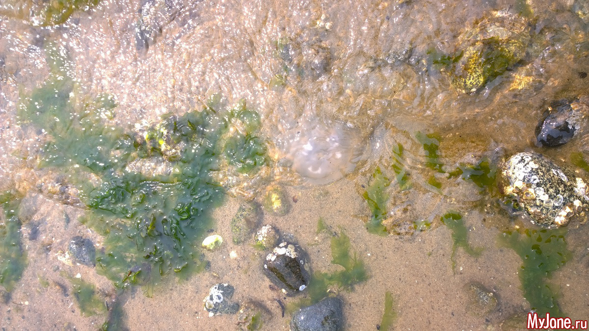с утра с Эммочкой пошли на дальнюю детскую площадку. Минут через 10-15 смотрю, а на дальнем конце футбольного поля медведь. Я быстренько собрала дщерь в охапку и мы почалупали домой. Она всем дома потом рассказывала про медведя. Жаль что не сфоткала, но как грицца мне было не до этого. А так день на пляжу. Медуза.Есть еще фотки крабов, но имхо я вас уже ими завалила.