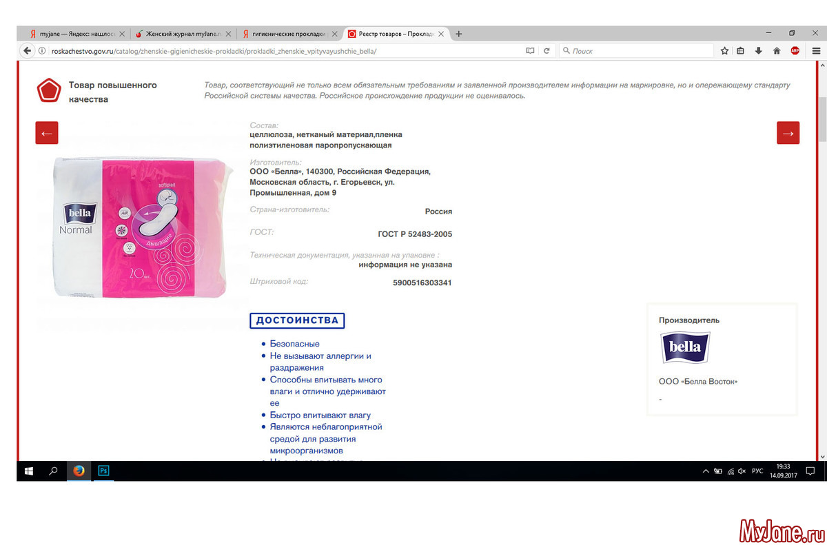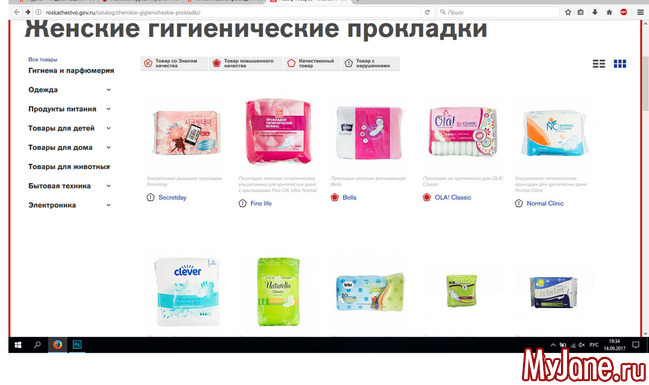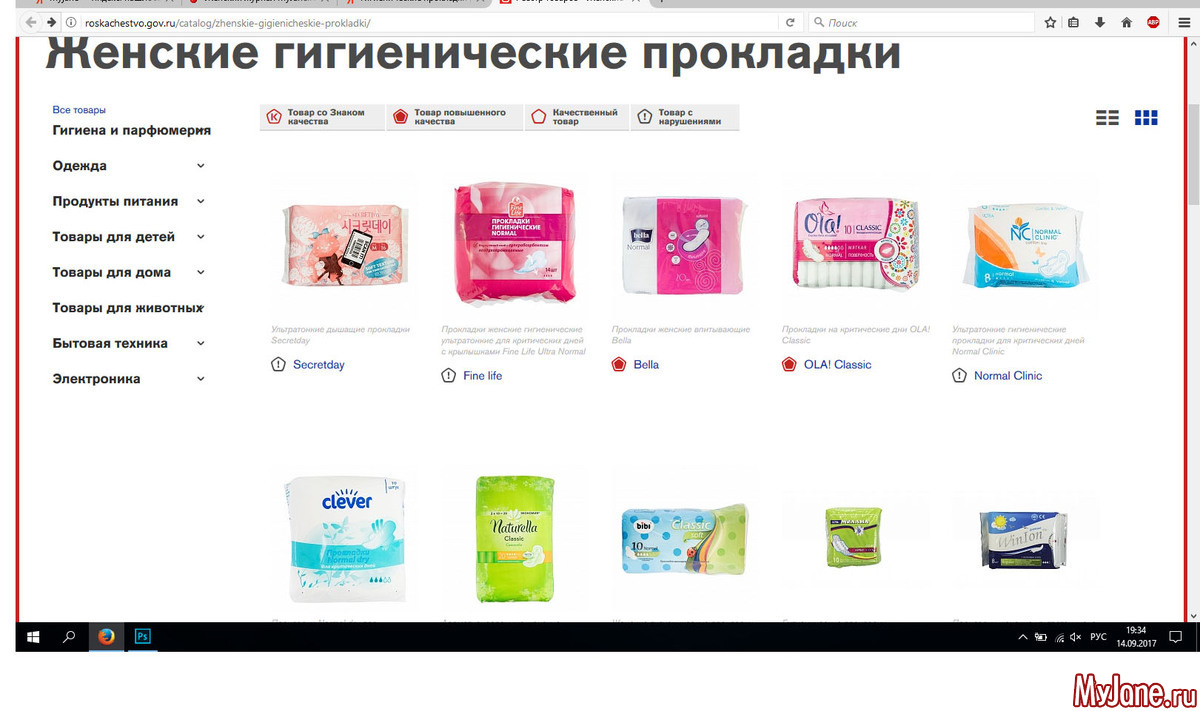 Российская система качества протестировала образцы 31 марки женских прокладок по десяткам параметров, включая впитываемость, микробиологическую безопасность, способность «дышать» и препятствовать развитию бактерий. В список брендов попали «OLA», «Libresse», «Always», «KOTEX», «Naturella», «Bella», «Натали» и другие. Кроме того, Роскачество подтвердило или опровергло мифы о средствах женской гигиены.