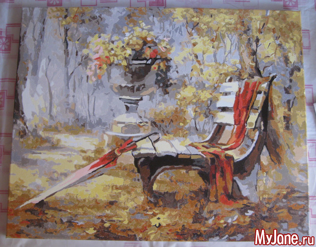 Картина в тему - золотая осень. Муж уже попросил ее в офис забрать. Так что, раз картина "в люди" выходит, я еще посижу, подретуширую и рамку закажу