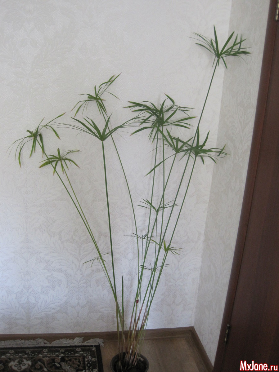 Принесла дочка отросток см. 7 высотой, поставила на подоконник. А он как давай расти, уже через неделю пришлось пересаживать! Через год это был уже целый куст больше метра в высоту. Циперус одно из немногих растений, которое невозможно залить, наоборот, он любит постоянную влажность, лучше поставить горшок в поддон с водой. Года два назад старый куст потерял привлекательность, я его выбросила, отсадив маленький отросточек. И вот такой вид он имеет сейчас: