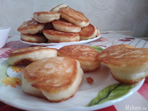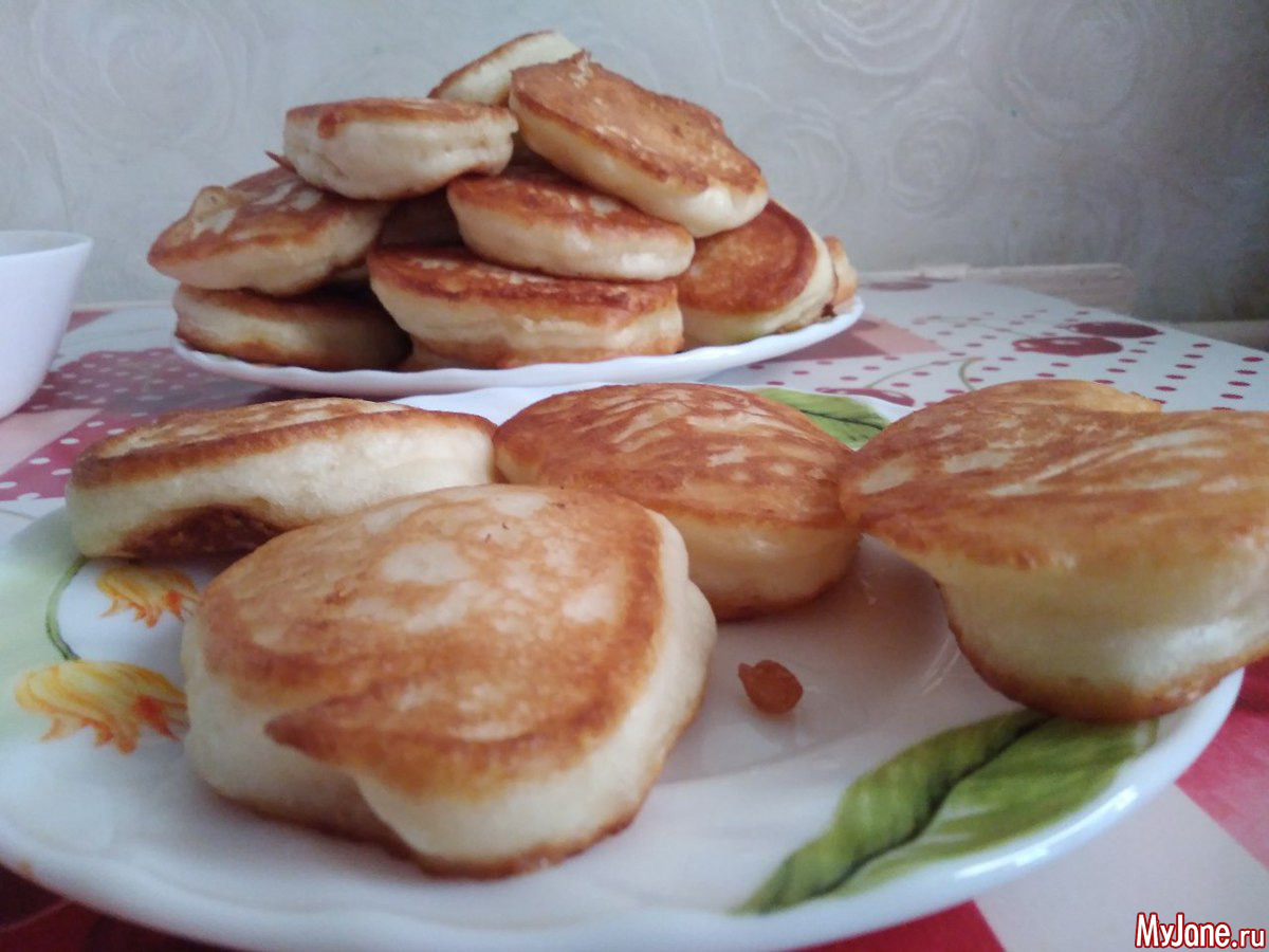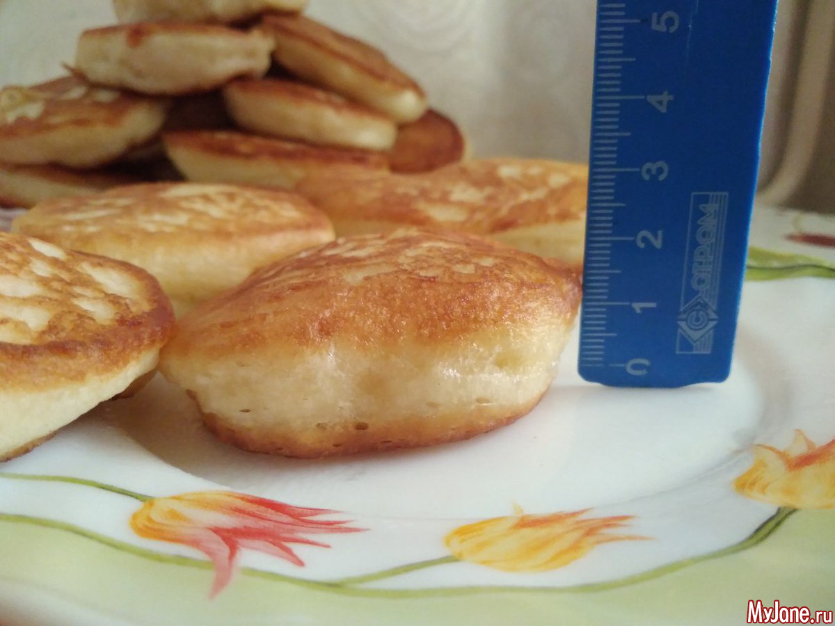 Смешать 1 стакан кефира, 1 яйцо, 2 ст.л. растопленного сливочного масла, 2 ст.л. сахара, 1 ч.л. ванильного сахара (ванилина). Отдельно просеять 1,5 стакана муки, щепотку соли, 0,5 ч.л. соды и 1 ч.л. разрыхлителя. Жидкую смесь влить в мучную и совсем легко перемешать, тесто должно быть с комочками. Оставить тесто на 20 минут. Не перемешивать! Жарить!