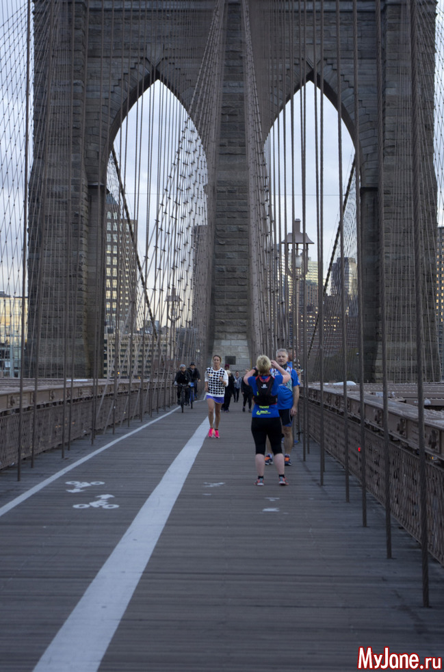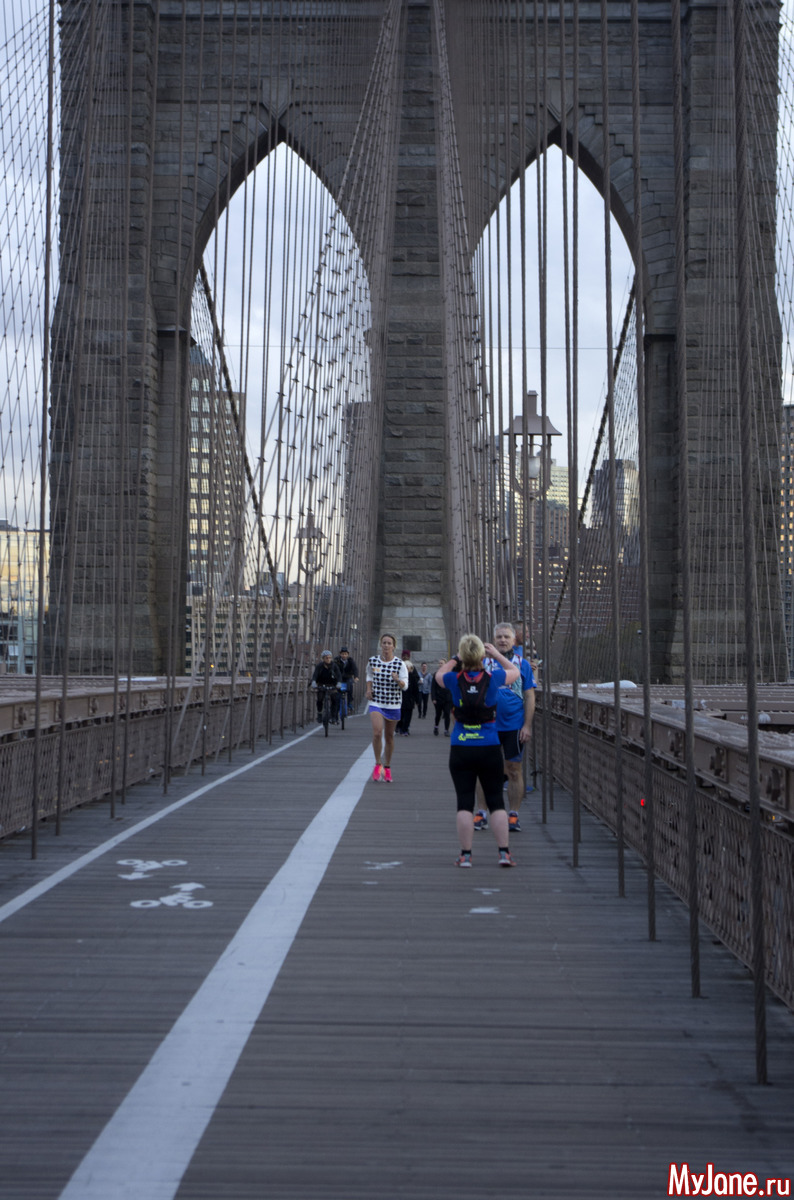А вот и Бруклинский мост. Спокойный, без толп туристов. Только бегающие по утрам спещащие на работу велосипедисты. Кстати, нам открыли страшную тайну. Оказывается, что те, кто бегает по утрам, имеют скидки на медицинскую страховку. Вот это, я понимаю, стимул.