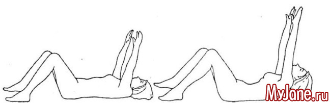 Исходное положение. Лежа на спине, согните ноги и поставьте стопы на пол на расстоянии 25-30 см друг от друга. Руки вытяните вверх к потолку перпендикулярно корпусу. Сделайте дыхательное упражнение.