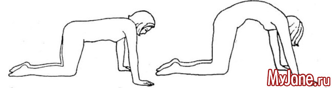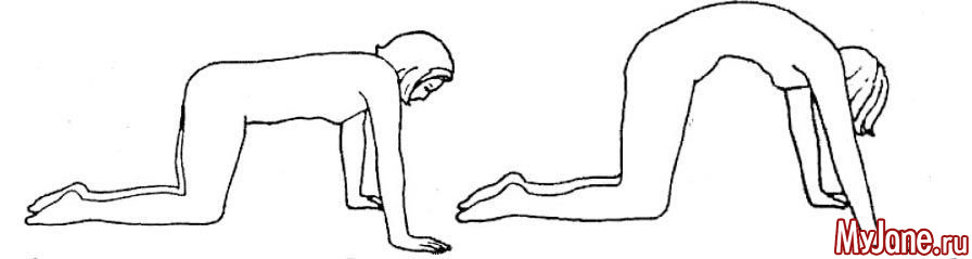 Выполнение упражнения. Опустите голову и прогните спину вверх как можно выше. Оставайтесь в этом положении в течение 10 счетов. Вдохните воздух и расслабьтесь.