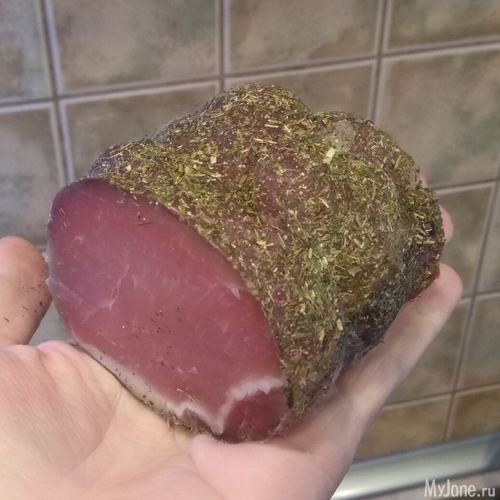 , и мы отрезали кусочек через 2 дня сушки, а остальное вернули назад сохнуть. Вообще время зависит от толщины и размера вашего куска. Трогайте его периодически и, когда вам покажется, что пора (или не сможете больше ждать), смело снимайте и пробуйте!