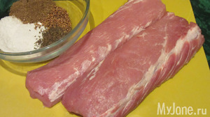 Берем мясо, полендвицу или любой другой хороший кусок. Вываливаем его в соли, хорошо вываливаем, так, чтоб весь кусок был полностью покрыт ею. Не боимся! Мясо возьмет ровно столько сколько ему надо. Обсыпаем его специями, которые любите. У меня был черный свежемолотый перец и и все. Можете сыпать, что хотите. Обсыпаем тоже хорошо, не жалеем! Кладем мясо в мисочку и сверху пресс... Я на мясо положила пластиковую крышку и сверху поставила 3х-литровую банку наполовину наполненную водой. Все, оставляем на столе на сутки!