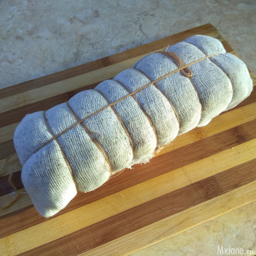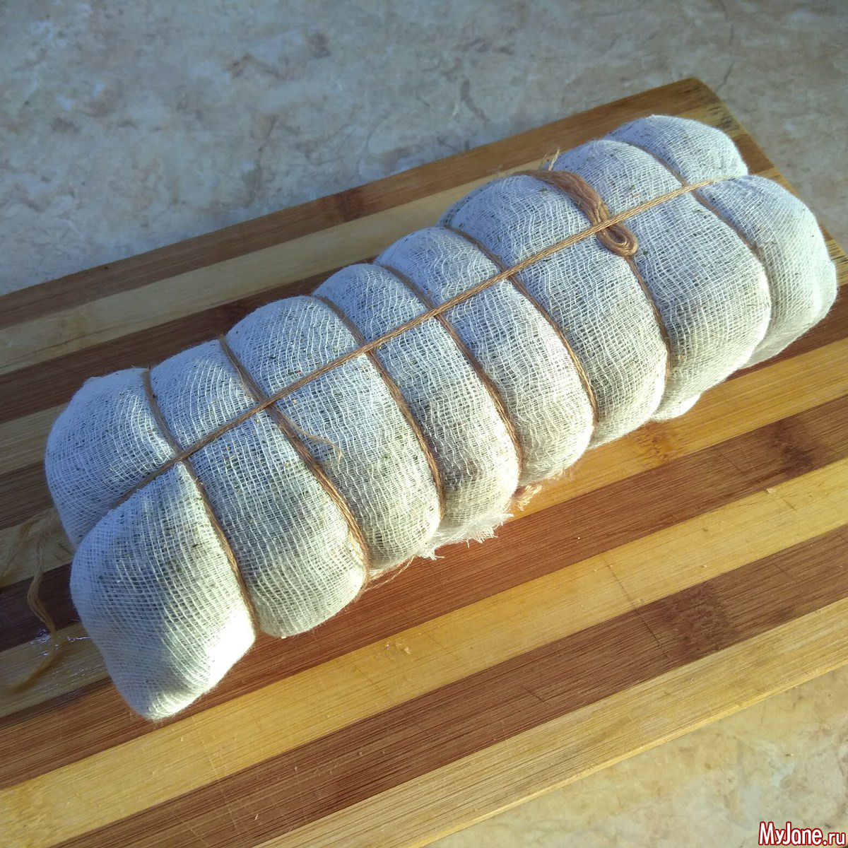 ), можете оставить так, голенькое. Это уже по вашему желанию.Берем кусок марли, заворачиваем в него наше мяско, плотно обвязываем веревкой и вешаем сушиться на 4-5 дней, если хватит силы воли