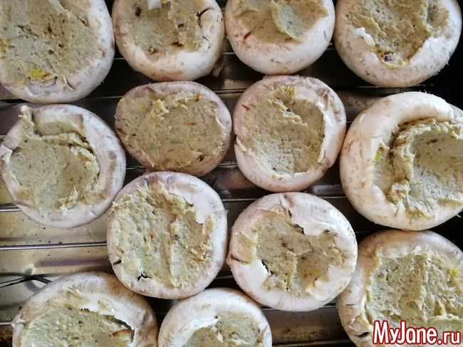 Нафоршировала грибы, сверху тёртый сыр. Получилось очень нежно и вкусно! И никто не догадается, что там. Особенно, если туда ещё положить разные специи и травки.