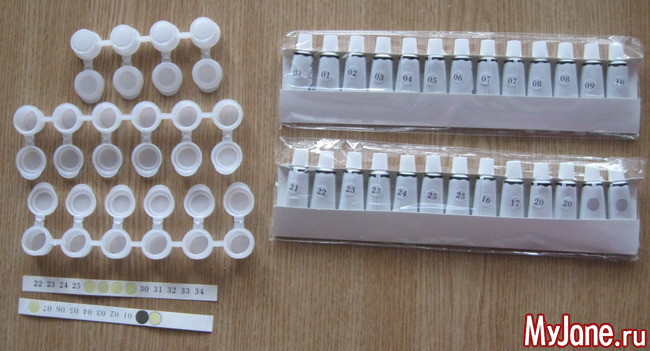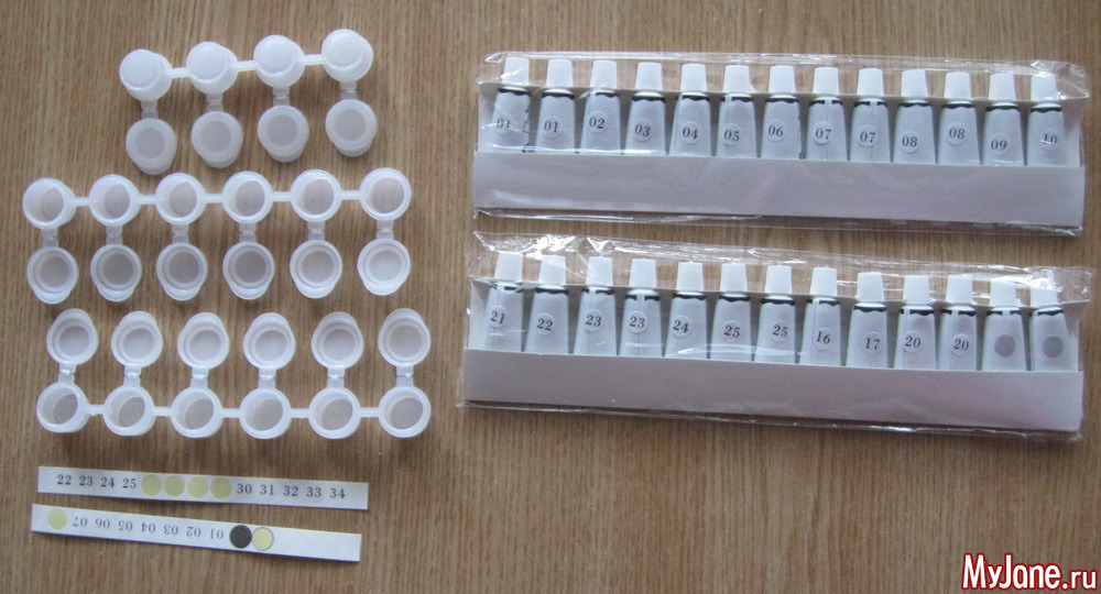 Так вот, краски тут не в баночках, а в тубах, и прилагаются еще пустые баночки и наклейки с номерами. Это выглядит так.