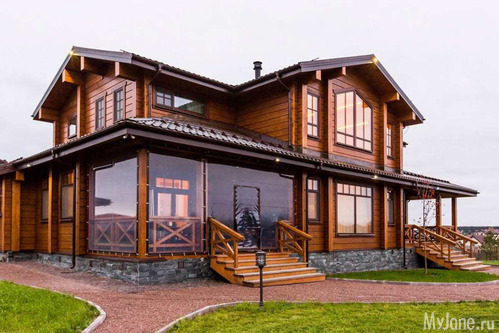 Вот домик с клеёного бруса мне нравится. Но вот это точно дороже. Я видела один у нас, чёрный. И там и беседка и гараж, всё.