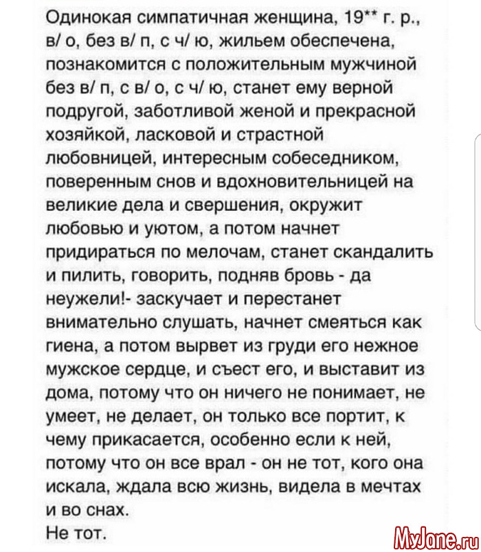 Я знаю, что некоторые девушки "работают на перспективу", мол мы сейчас живем с парнем вместе, через лет 5 поженимся (+ позже дети), то почему бы сейчас не платить хотя бы пополам? Но этой перспективы у героя моей статьи нет -- ему нужна девушка здесь и сейчас, чтобы просто с ней жить. А лет через 5 он найдет себе моложе и "качественней". С таким ни одна уважающая себя девушка мириться не будет, потому что девичий век недолог. Это парень и в 30 лет может считаться завидным холостяком, а девушка в этом возрасте считается уже старой девой (если она, конечно, не дочь миллионера/политика/аристократа). Так или иначе, девушки "заточены" на создание семьи, а сожительство -- это, как правило, ОДИН ИЗ выборов дам постарше. Только эти дамы г-на Сорвачева не интерисуют.