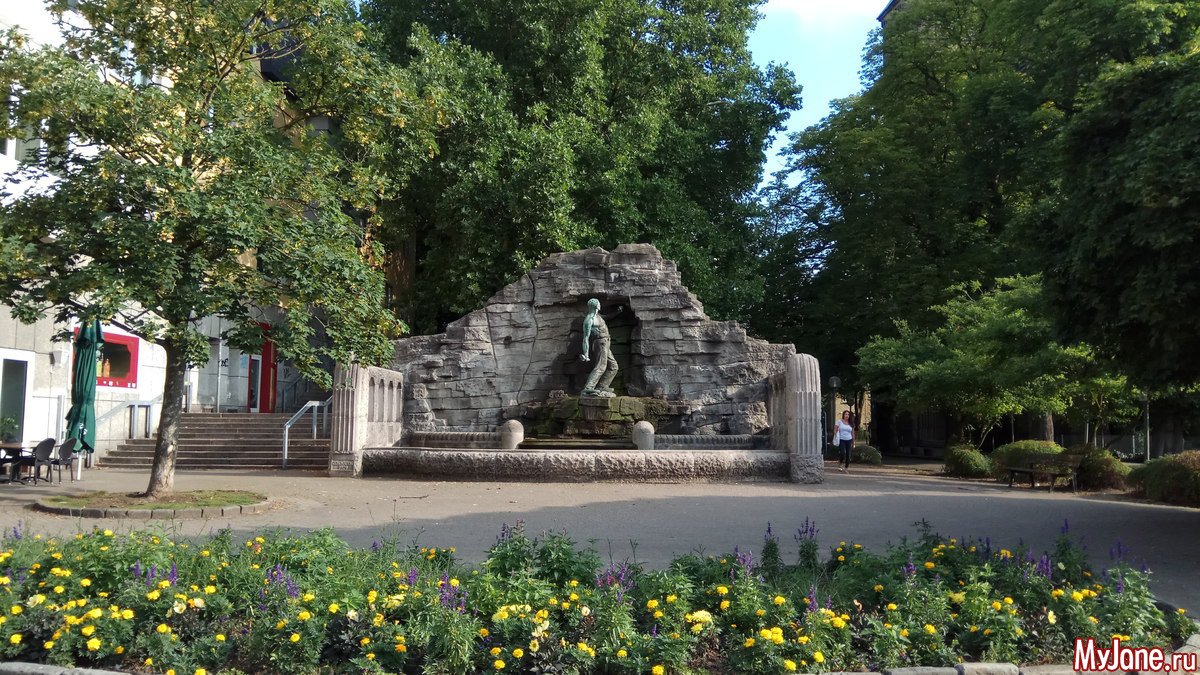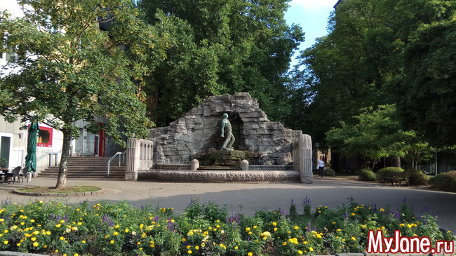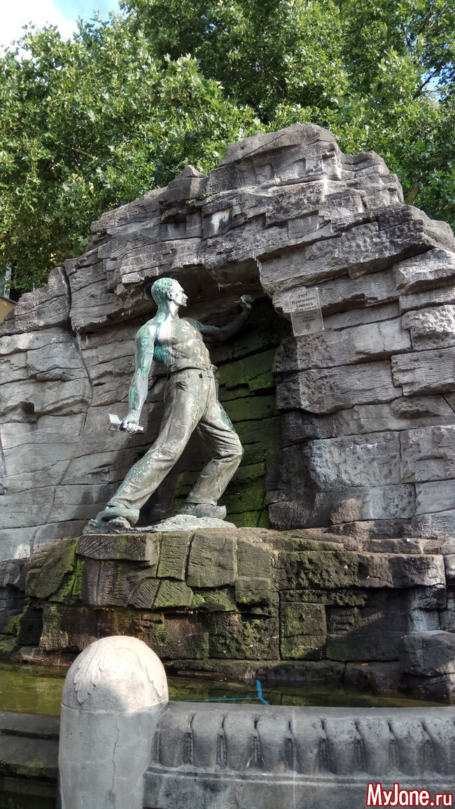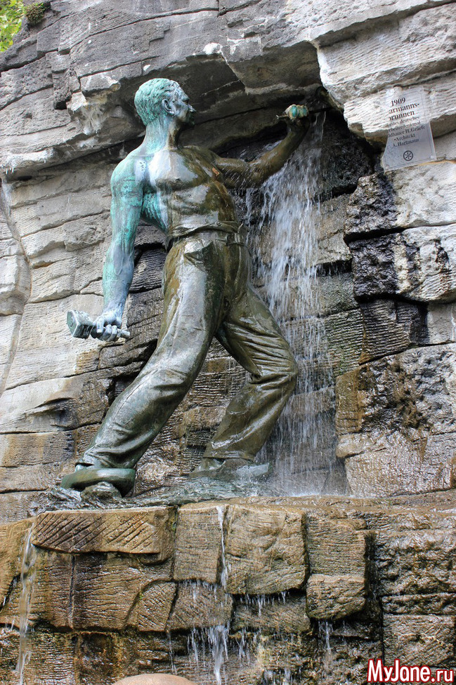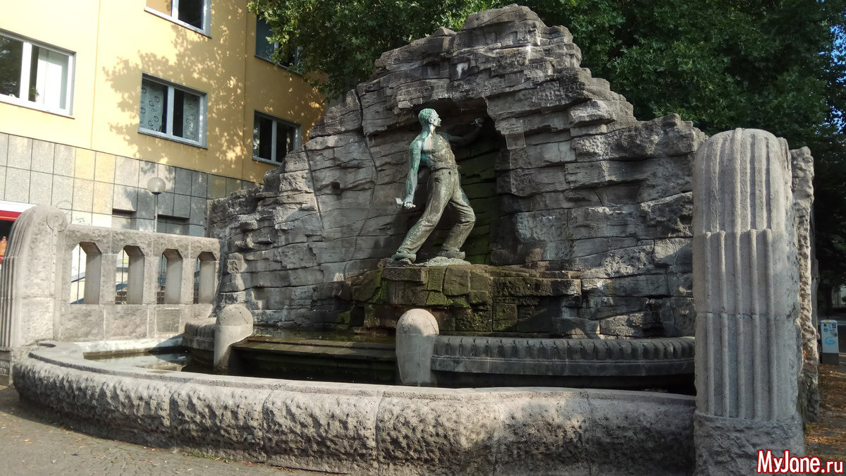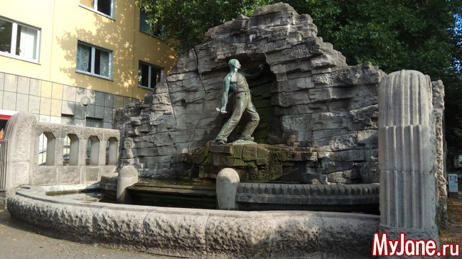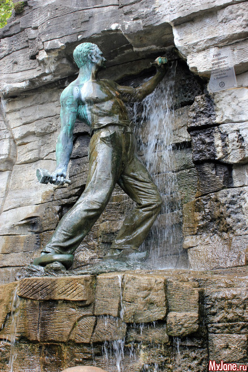 Выходя из здания парковки проходим вот такой фонтан (увы, вода к тому времени была отключена). Это памятник шахтёрам, с 1909 года, и числится одним из старейших памятников, посвященный "рабочему классу" в Германии.