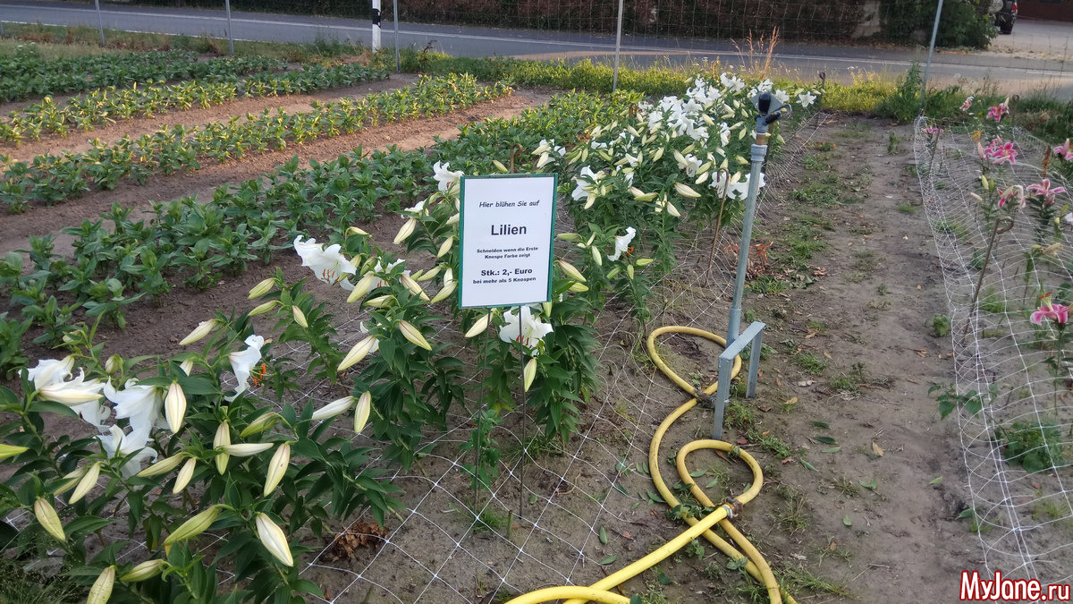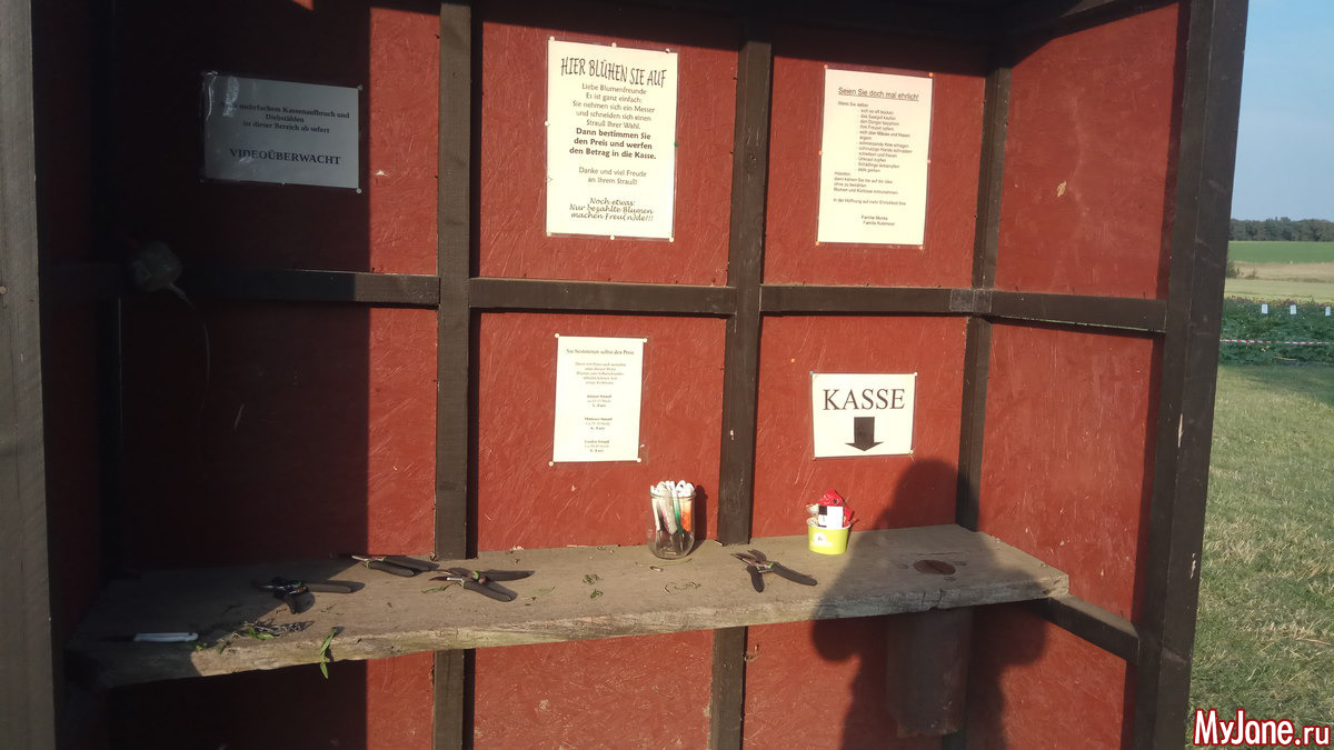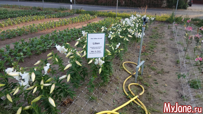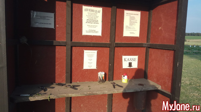 А цена - у некоторых грядках стоят шильдочки (к примеру, одна лилия = 2 €), у некоторых же "На Ваше усмотрение". В домике с ножиками/ножницами стоит коробочка, куда можно забросить деньги. К сожалению, многие пользуются тем, что вокруг ни души и либо вообще ничего не бросают и ухoдят с охапкой цветов, либо же пару сентов. Я же считаю, люди стараются сделать приятное, сажают, ухаживают за полем и ты уходишь оттуда со свежими цветами. Поэтому жадничать здесь не стоит...