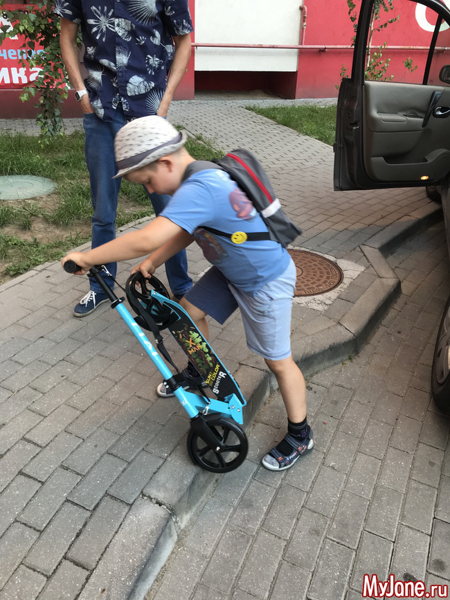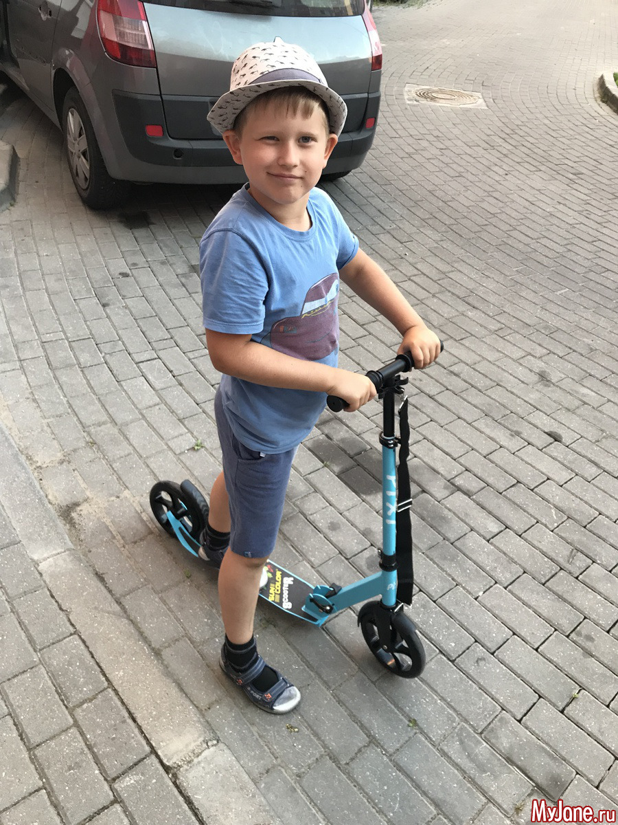 В начале августа Илье неожиданно прилетело немного денег от моей мамы в честь Ильина дня. ЦУ такое - купить Илье подарок, но не игрушку. Маман категорически против игрушек. Ок, хорошо. Герою нужны сандали, на нём обувь прямо горит. После долгих размышлений решили купить самокат. Это была незапланированная покупка, поэтому было важно уложиться в бюджет. Я нашла офигенный самокат польско-китайского производства с большими колёсами, по распродаже, последний. Это оказалась, видимо, какая-то секретная разработка танкового завода - в самокате не было ни одной пластиковой детали! Он реально неубиваемый!