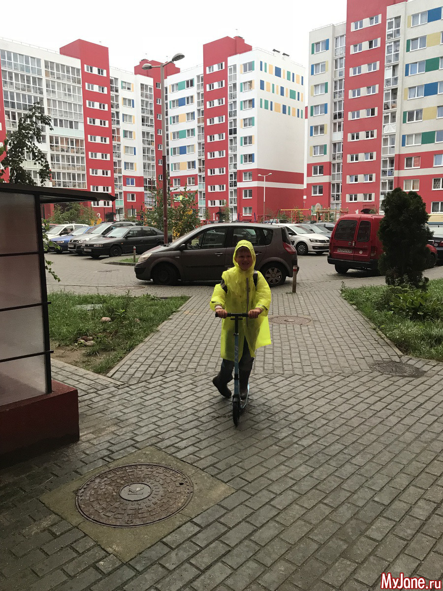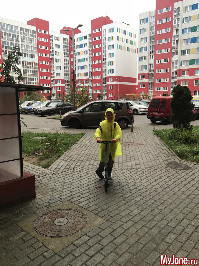 К самокату пришлось еще покупать дождевик. Сейчас герой полностью укомплектован и ничто не может удержать его дома.