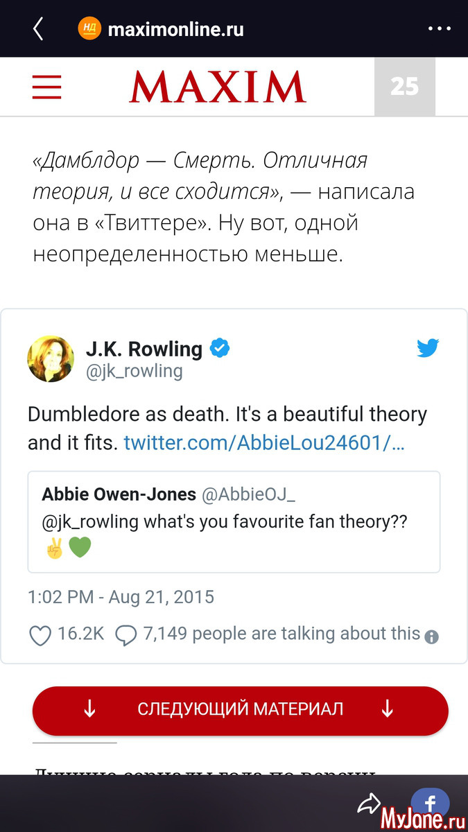 «Дамблдор — Смерть. Отличная теория, и все сходится», — написала она в «Твиттере». Ну вот, одной неопределенностью меньше.