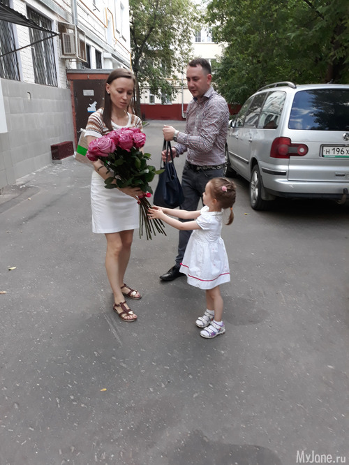 Настя и папа встретили с работы и поздравляют маму с днём рождения.