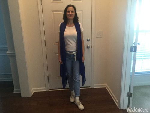 Пошла я в аптеку за лекарствами... На глаза попались мне красивые шарфики. Купила пару штучек. Один по цвету очень хорошо подошел к моим туфлям. А второй, ну очень понравися цвет! Самый мой любимый цвет! Прельстилась еще ценой, все стоило сколько долларов. Принесла домой, распаковала. Один так и оказался шарфиком, а второй оказался накидкой типа пыльника. Очень хорошо надевать поверх майки или однотонной блузки. Хотела порезать его на шарфик. Отгладила, надела, мужу понравилось. Решила оставить как есть. Вчера "выгуляла" его в колледж. Очень неплохо смотрелся с джинсами и майкой, придал им более нарядный вид.