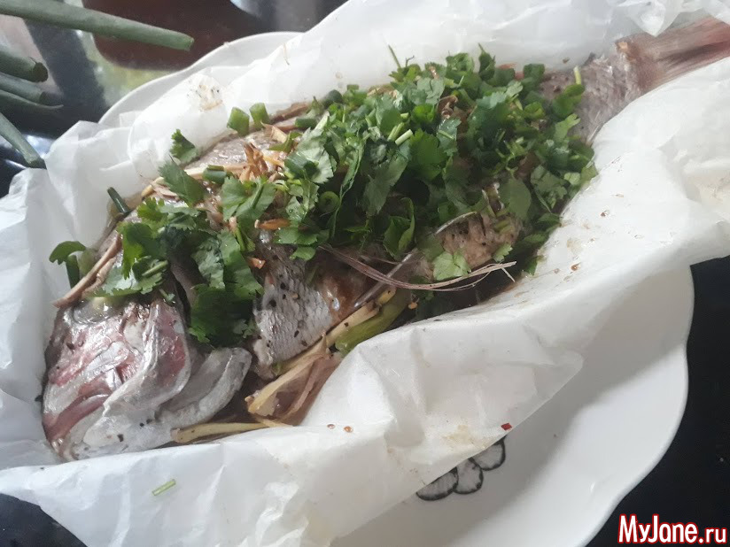 в общем берем целую рыбу, чистим, все как положено... потом солим, перчим, кладем имбирь и зеленый лук сверху... и тут самое главное... надо взять пекарскую бумагу и намочить ее в воде... затем положить рыбу на влажную бумагу и завернуть ее со всех сторон... вот так она и получается ни вареная, ни печеная... запекать 20-30 минут при 190 градусах... в это время можно соусы поделать... смешать соевый соус (2 столовые ложки), сахар (0,5 чайной ложки) и кунжутное масло (1 чайная ложка)... а в сковородке пожарить нарезанный соломкой имбирь (в рецепте жарить надо на арахисовое масле, но я думаю и обычное подойдет)... готовую рыбу полить соусом, посыпать жареным имбирем и посыпать зеленью (кинза, чили и зеленый лук)... вкусно!