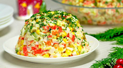 4. Смешать все продукты в одной миске, добавить 2 ст. л. домашнего майонеза, соль, перец и тщательно перемешать.