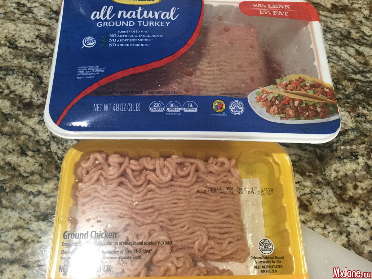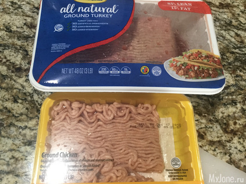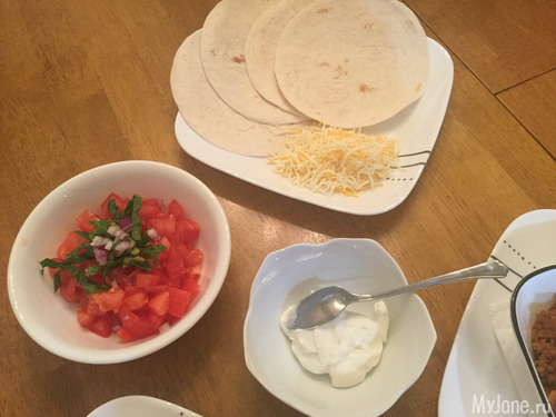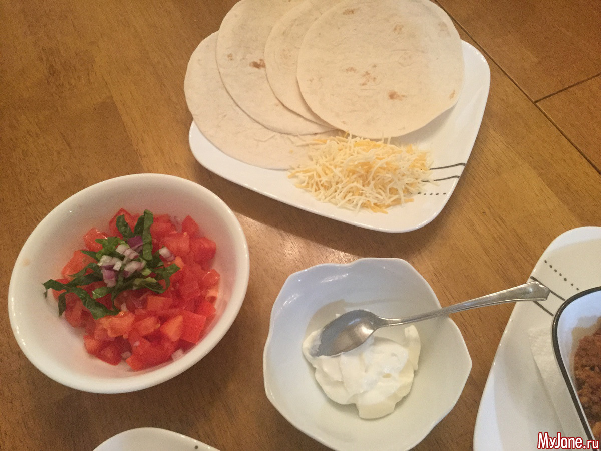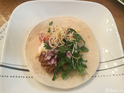 Сегодня у меня под рукой оказался фарш индюшки и куриный. Немного помидор, зеленый сладкий перец, лук обычный и лук красный, салат романский, сметана и тертый мексиканский сыр. Немного специй и соус для тако. Ну и, собственно, сами лепешки.