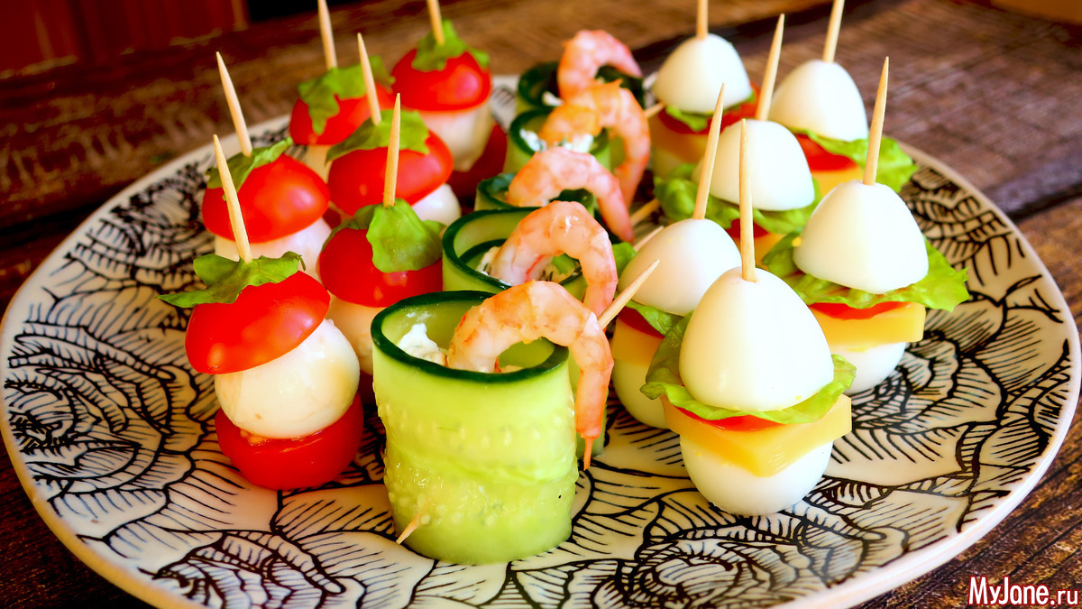 3. Для закуски из креветки: Креветки отвариваем, очищаем, огурец нарезаем на тонкие полоски, творожный сыр смешиваем с зеленью и выкладываем на огурец, сворачиваем рулетиком, закрепляем шпажкой, сверху втыкаем креветку.