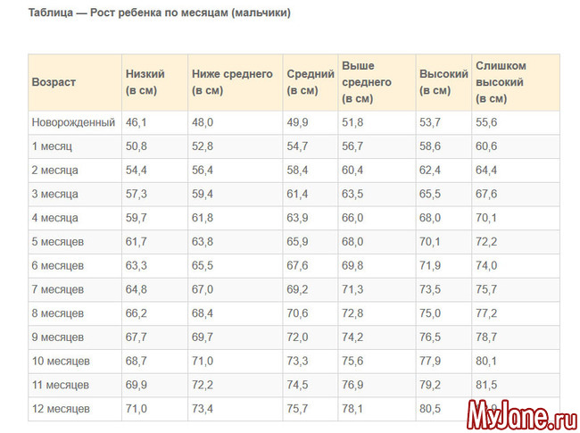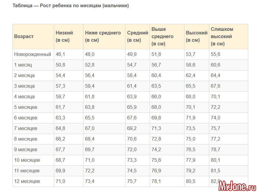 Рост новорожденного по месяцам распределяется в следующем темпе: с 1 по 3-й месяц — 3,5 см, с 3 по 6 — 2,5 см, с 6 по 9 — 1,5-2 см, с 9 по 12 — 1 см ежемесячно.