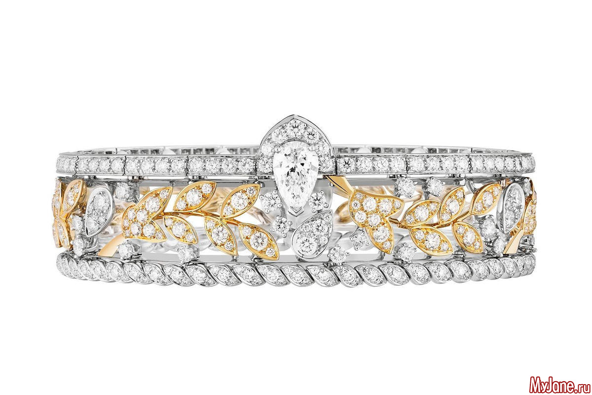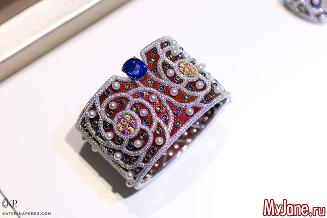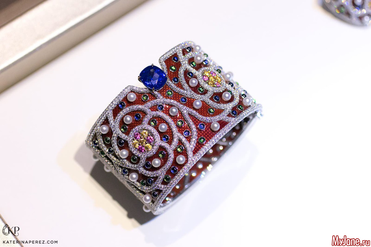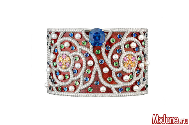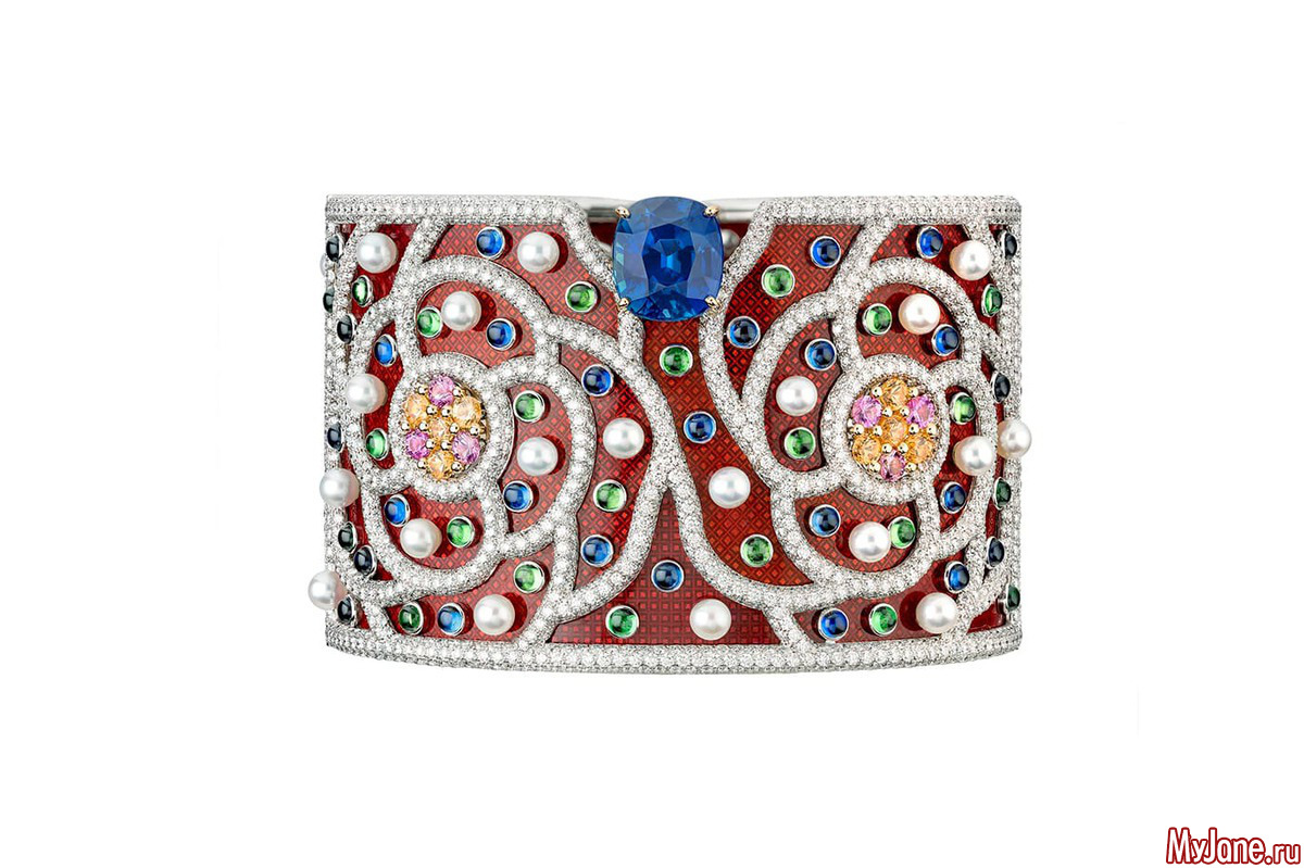 Кафф ’Folklore’ из коллекции Chanel ’La Paris Russe de Chanel’ из белого и желтого золота с эмалью, голубыми и розовыми сапфирами, цаворитами, мандариновыми гранатами, жемчугом и бриллиантами