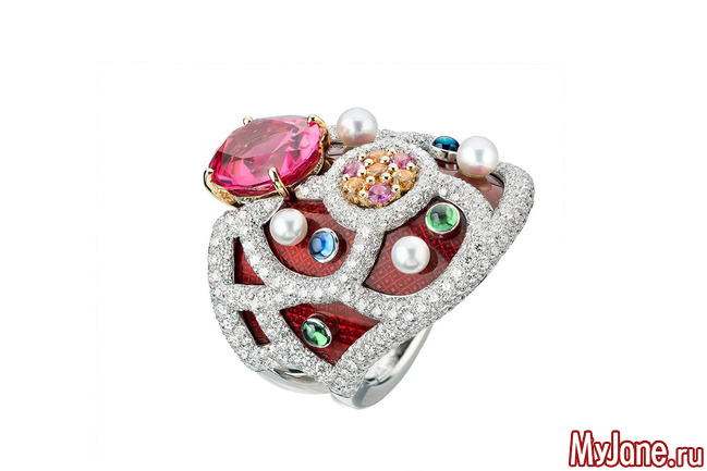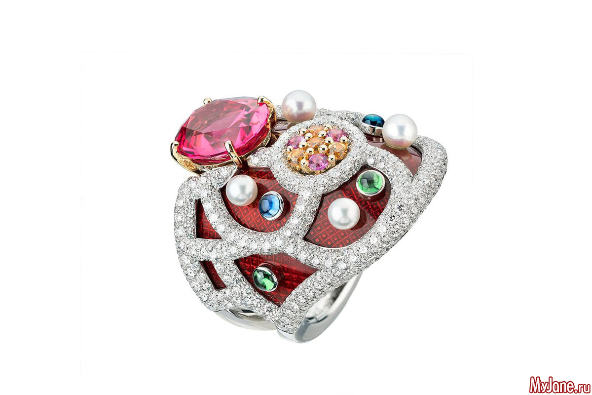 Кольцо ’Folklore’ из коллекции Chanel ’La Paris Russe de Chanel’ из белого и желтого золота с эмалью, розовой шпинелью, голубыми и розовыми сапфирами, цаворитами, мандариновыми гранатами, жемчугом и бриллиантами