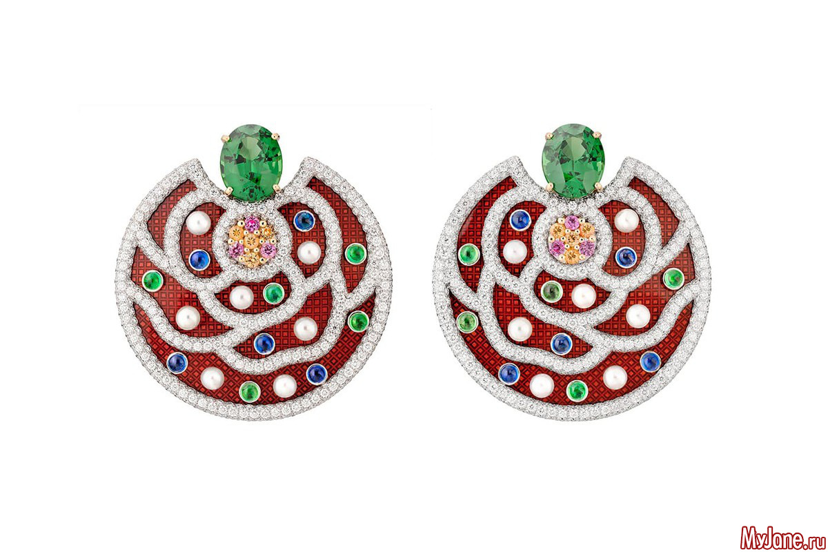 Серьги ’Folklore’ из коллекции Chanel ’La Paris Russe de Chanel’ из белого и желтого золота с эмалью, голубыми и розовыми сапфирами, цаворитами, мандариновыми гранатами, жемчугом и бриллиантами